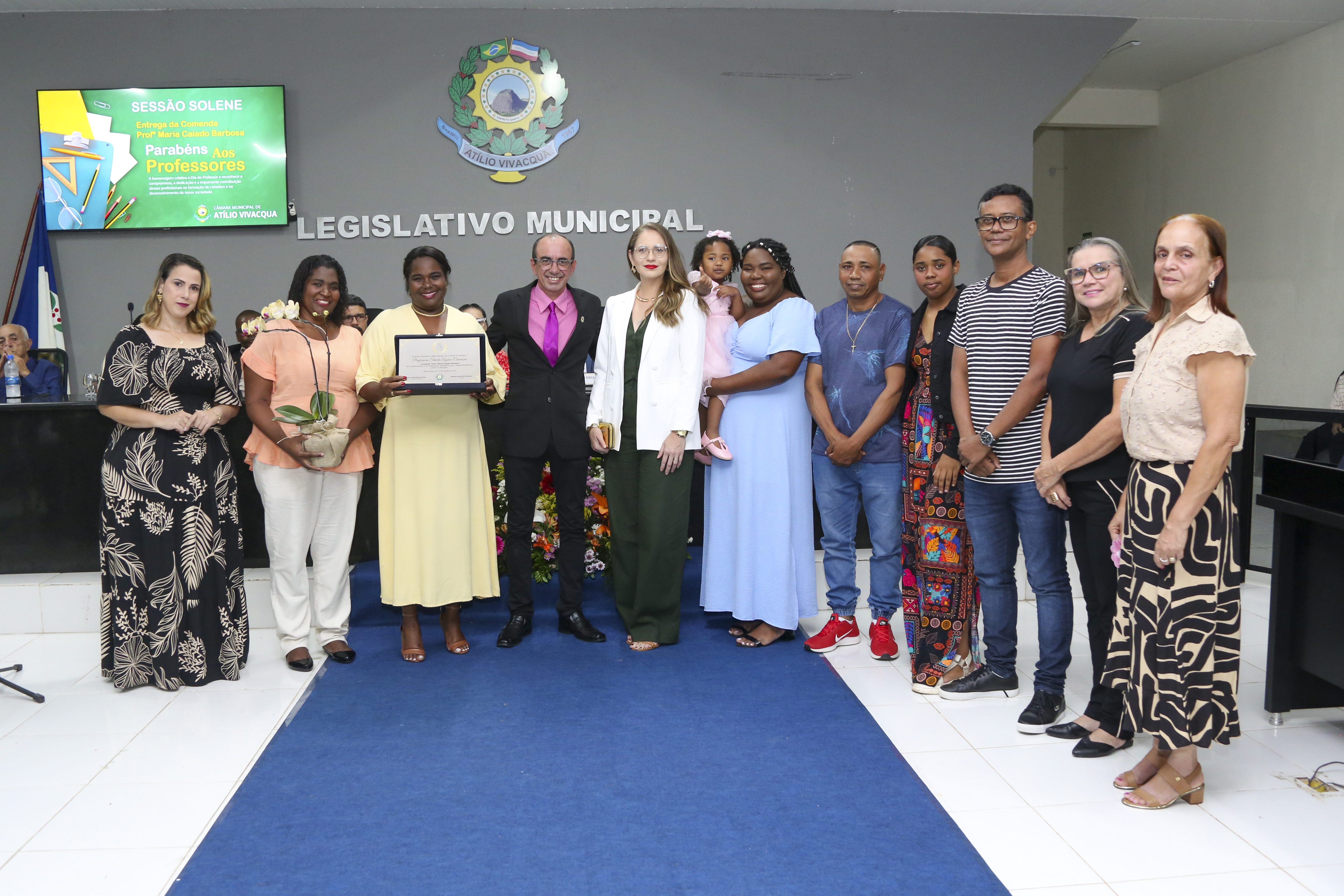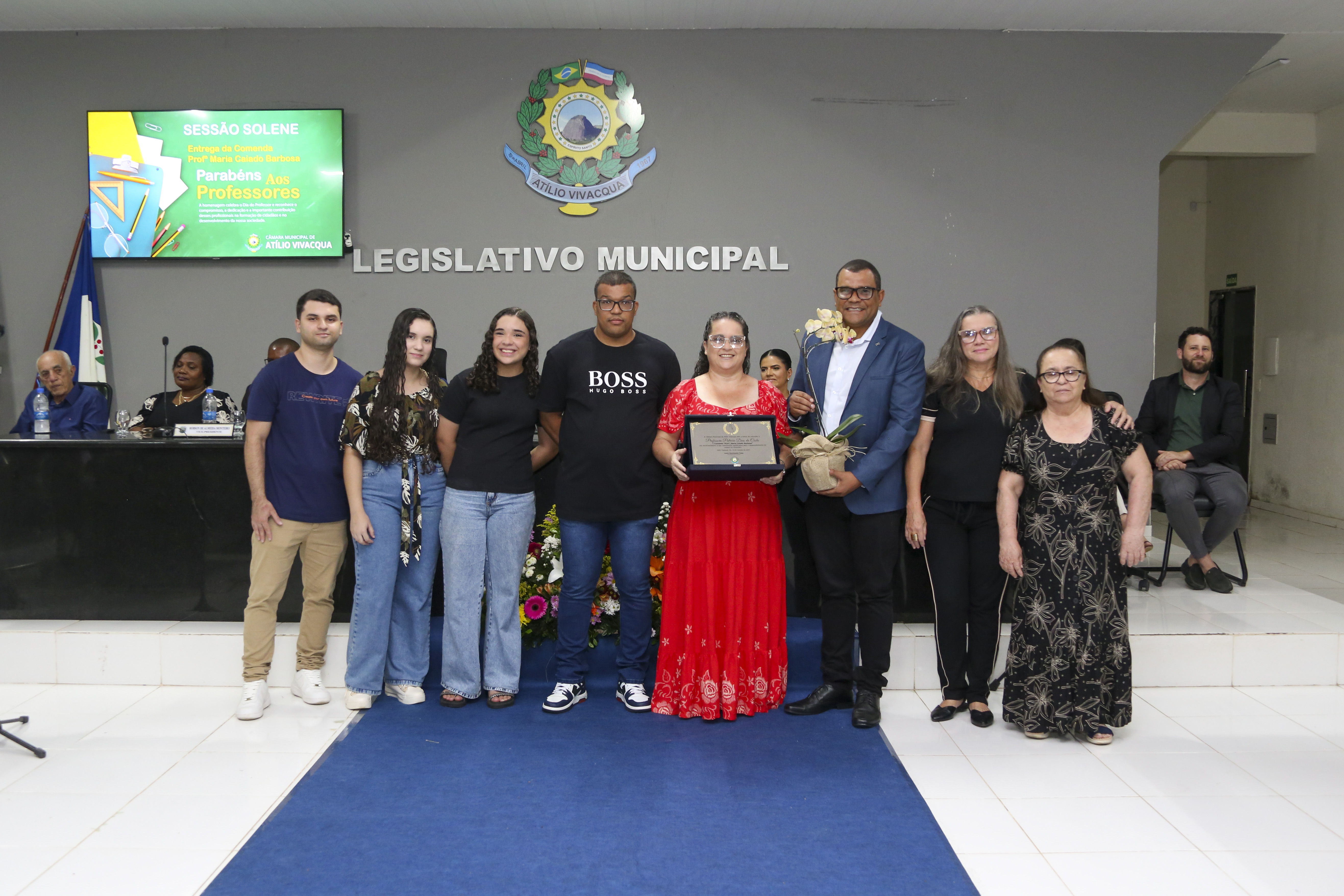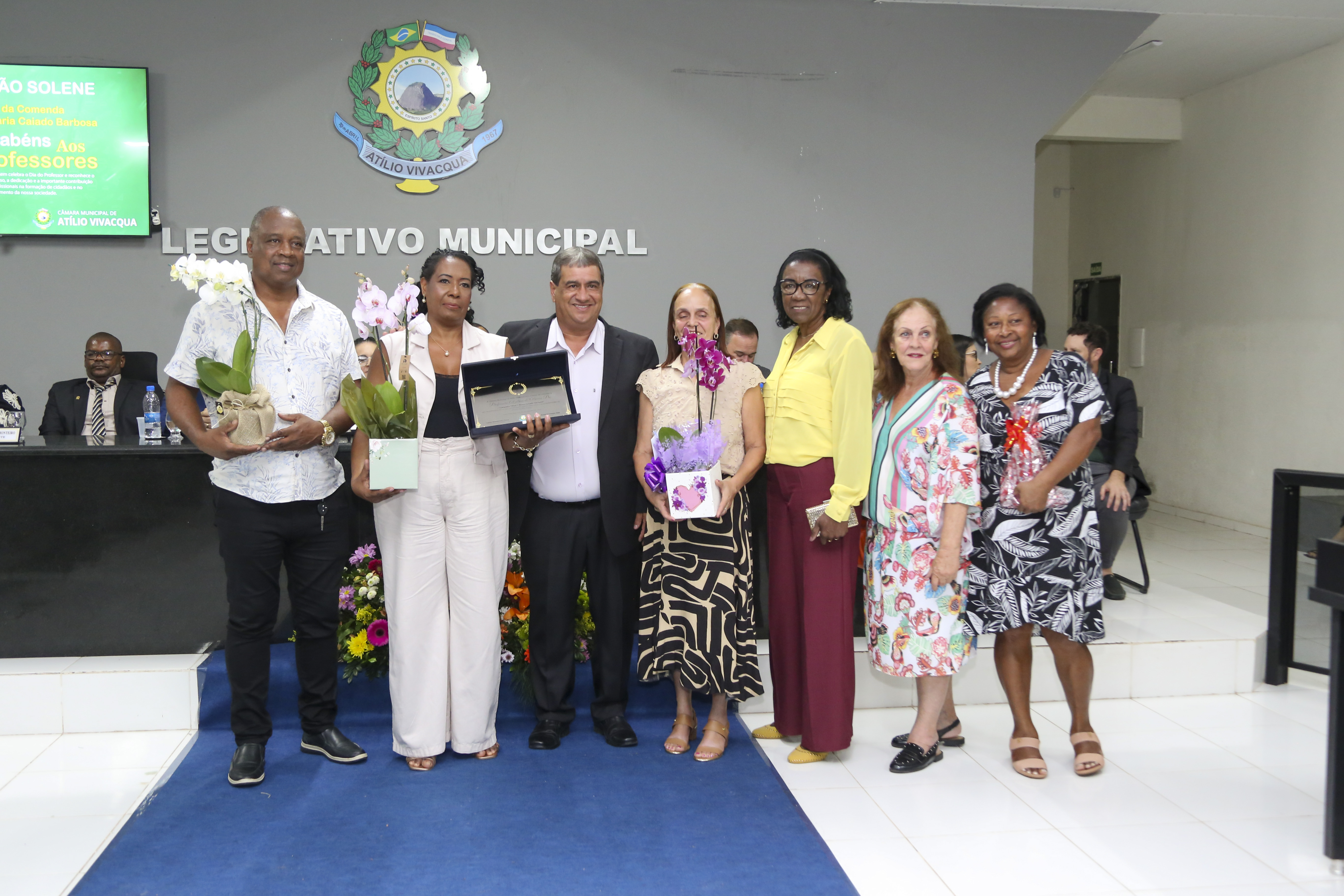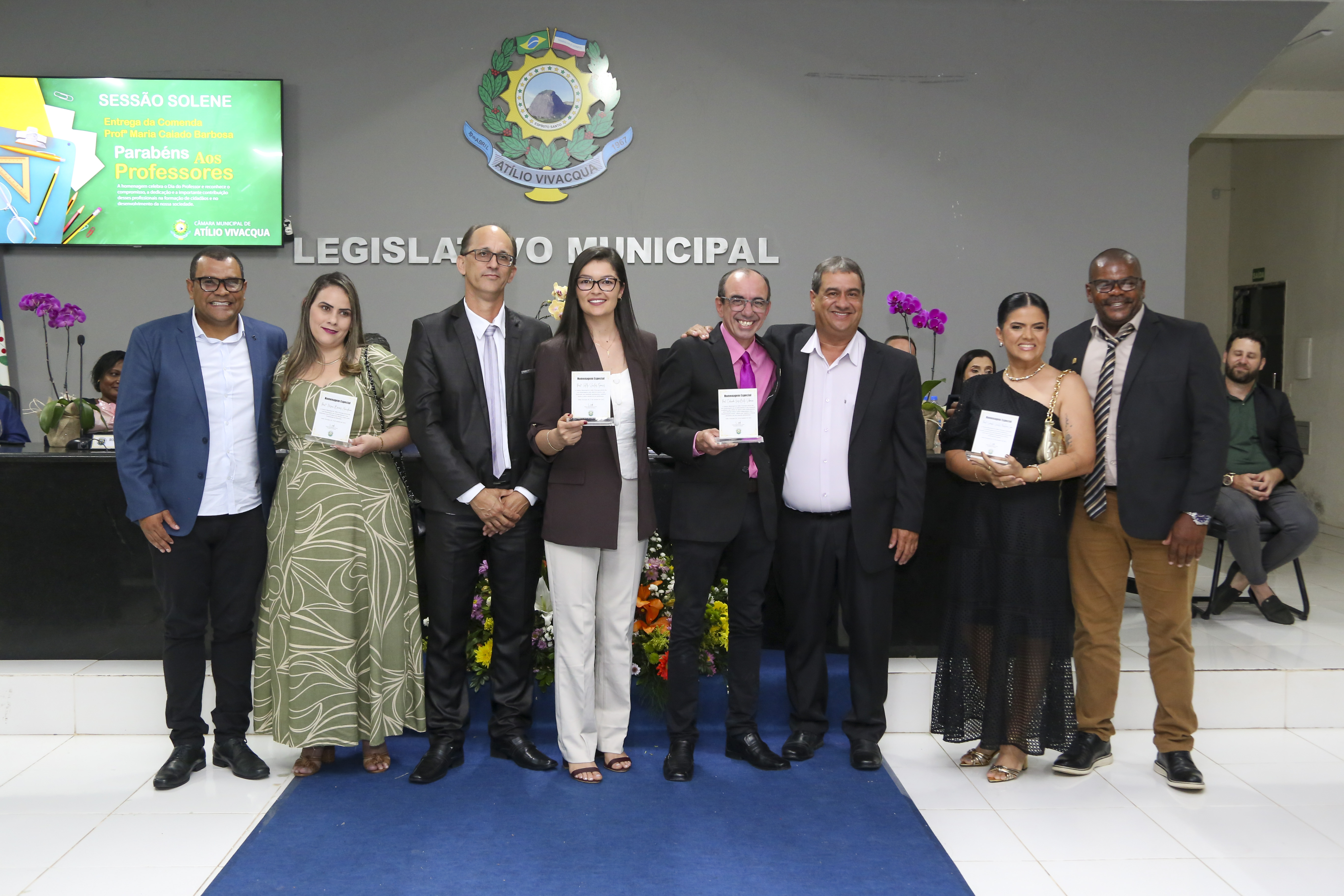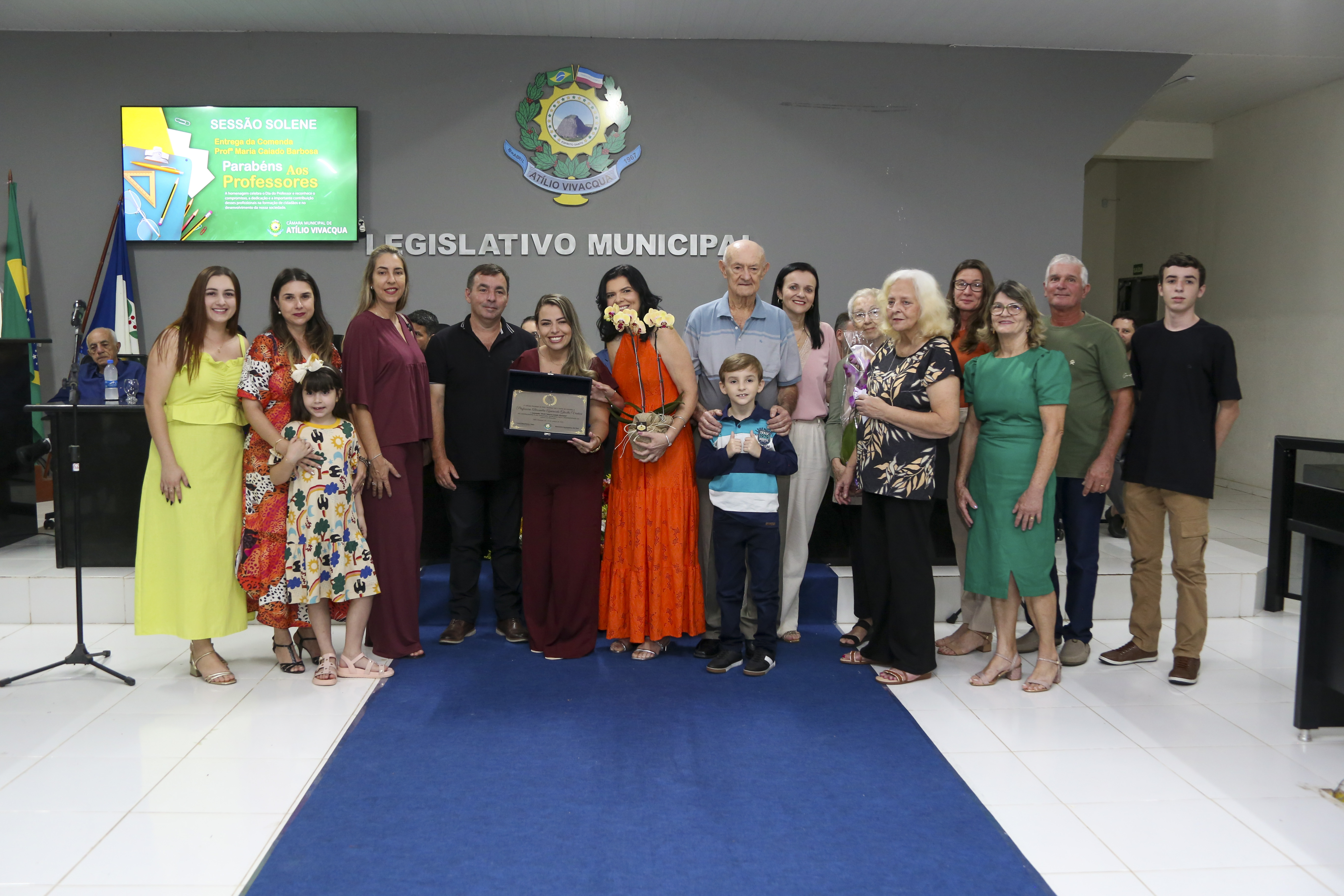 A Câmara Municipal de Atílio Vivacqua realizou, na noite desta terça-feira, 14, a 4ª Sessão Solene de 2025, dedicada à celebração do Dia do Professor, comemorado anualmente em 15 de outubro. A cerimônia teve como destaque a entrega da Comenda “Professora Maria Caiado Barbosa”, honraria concedida a educadoras que se destacam pela dedicação, compromisso e amor à profissão.